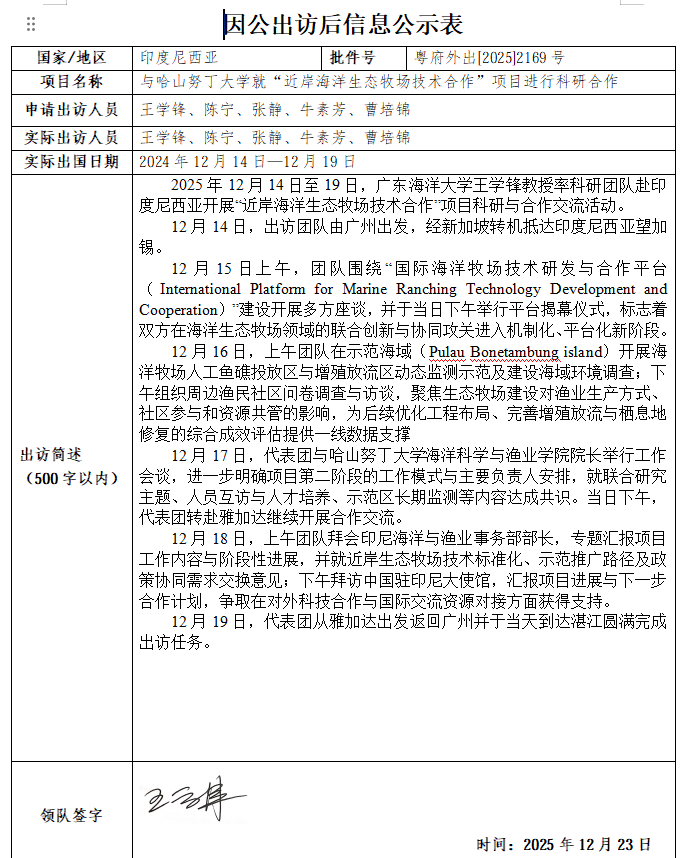 根据《关于进一步规范省部级以下国家工作人员因公临时出国的意见》的要求,现将广东海洋大学因公出访信息予以公示(详见附件)。公示时间为2025年12月23日至12月28日。如有意见,请在公示期内,向相关单位反映。